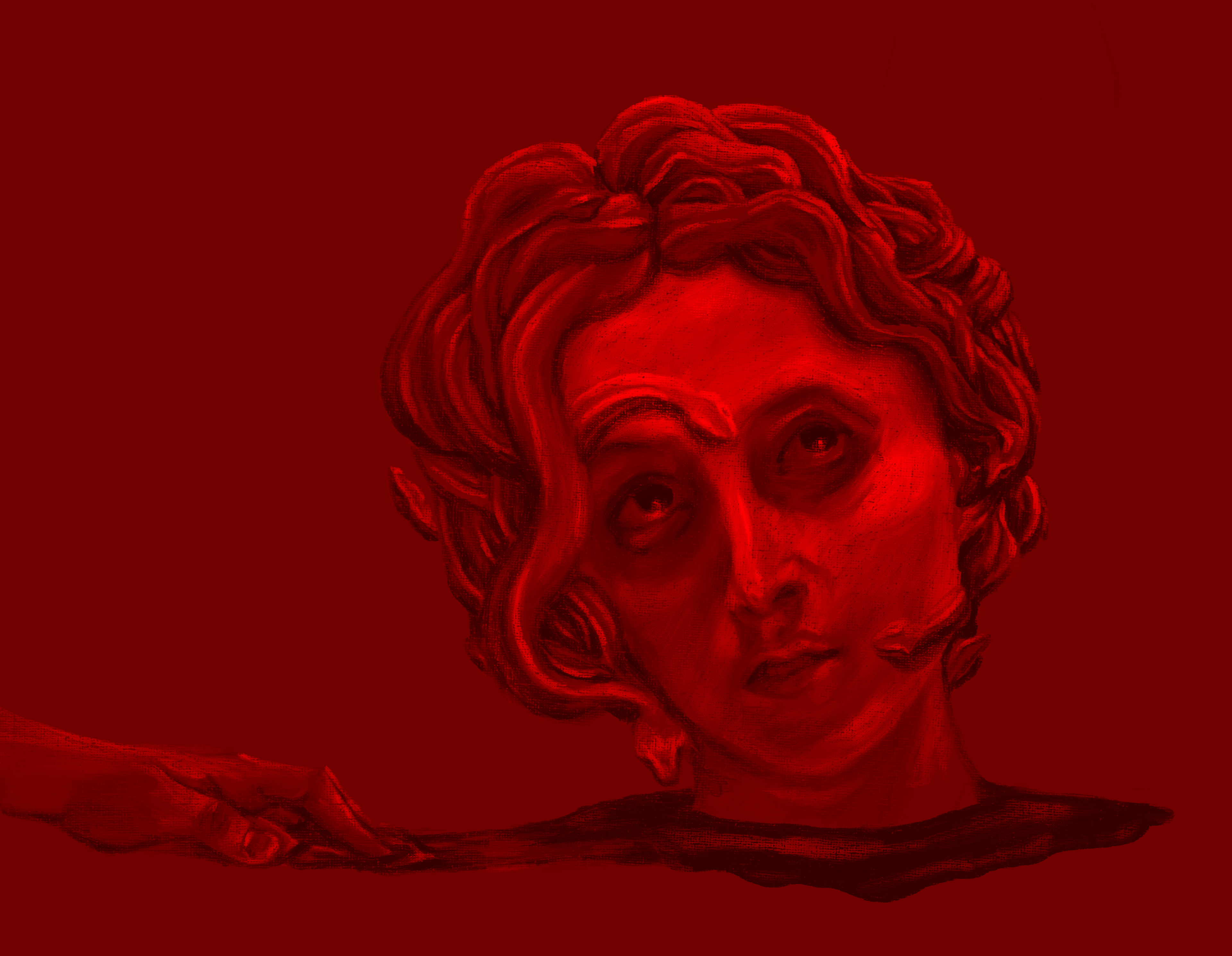 This piece explores the subjugation of women through the lens of Medusa. Batterman uses appropriative methods from Hugues Merle's "Mary Magdalene in the Cave" (1868). Modeling the face of Medusa from Merle's Magdalene, she connects the antiquated Catholic transliteration of history to the patriarchy writ large as Magdalene's legacy becomes purposefully disparaged within biblical narratives. Batterman examines the Medusa myth through a similar contemporary feminist perspective, finding a significant comparison between her decapitation and the silencing of female figures throughout history as they are demonized in a rewritten patriarchal chronology.